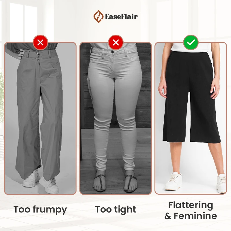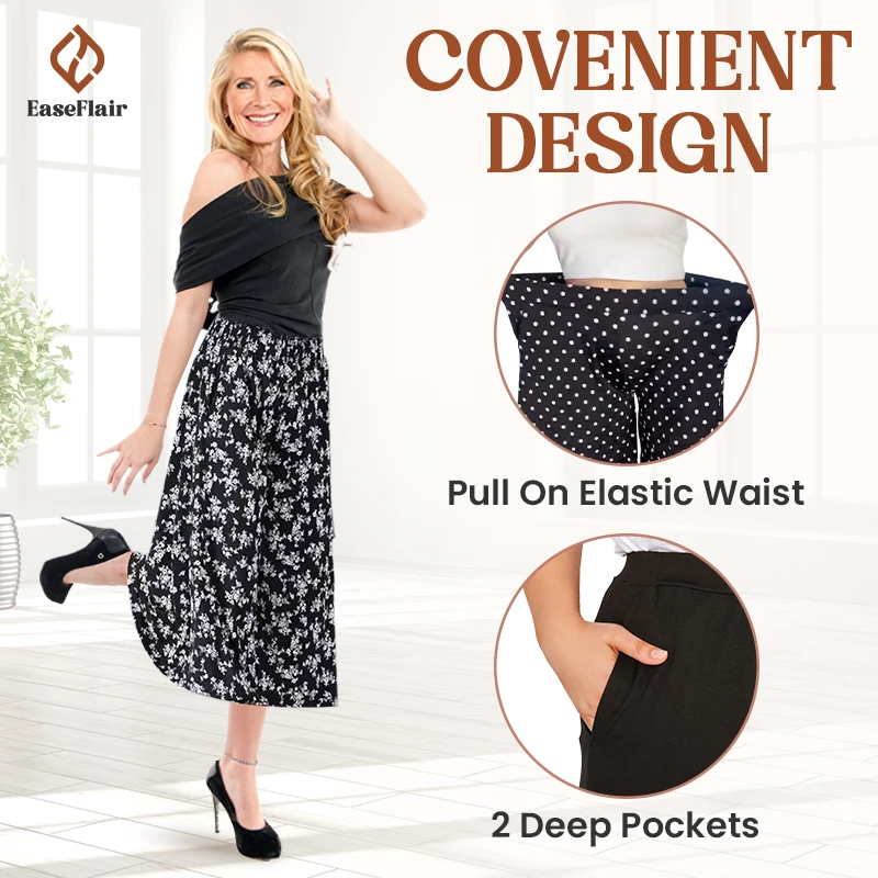Wide-leg cropped design and feminine patterns offer the look of a skirt but with added security and comfort of pants. EaseFlair transitions smoothly from casual to formal with endless styling options.